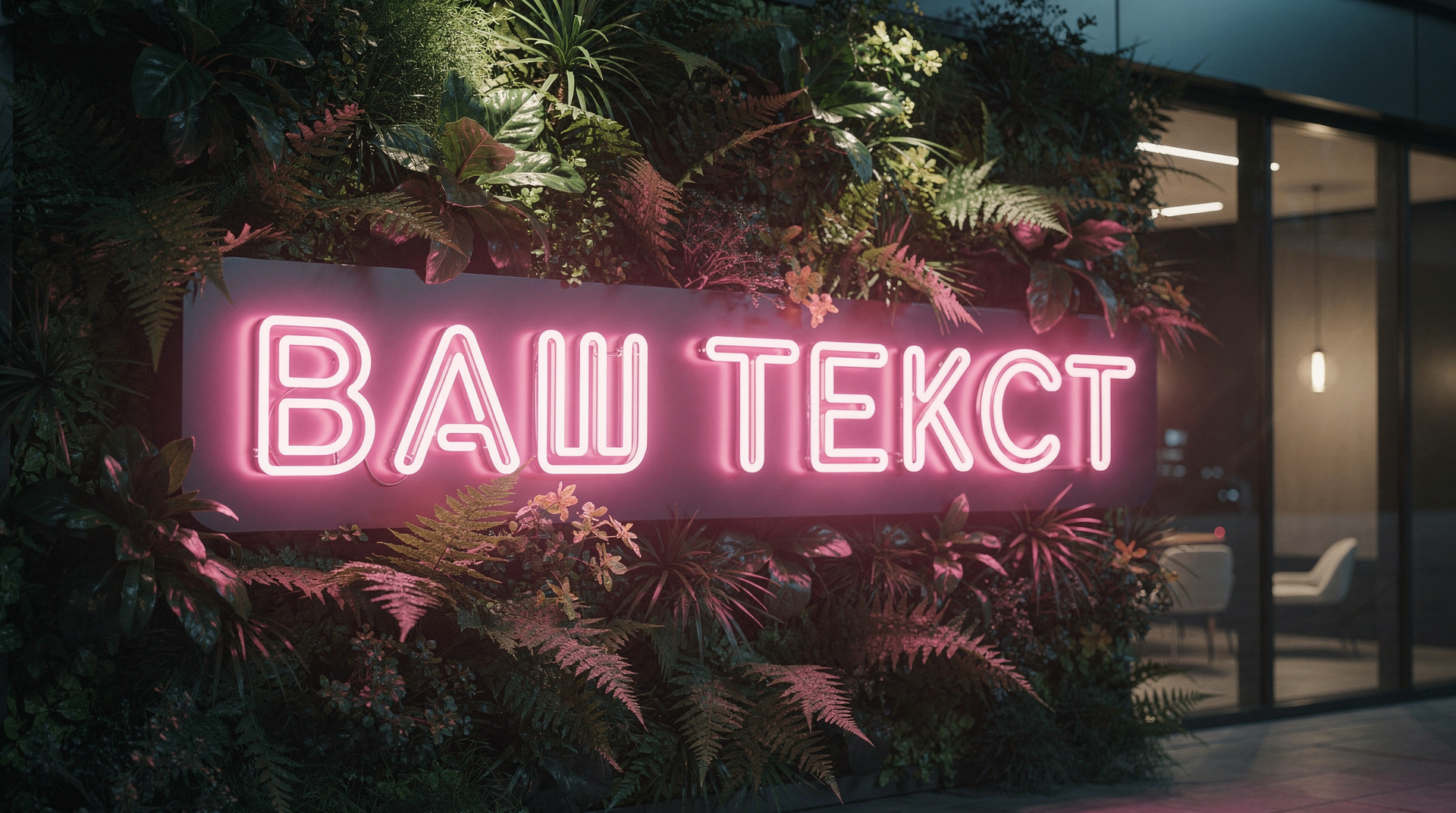 неоновая вывеска | розовый неон | городской стиль | папоротники | зеленый фон | стеклянное окно |